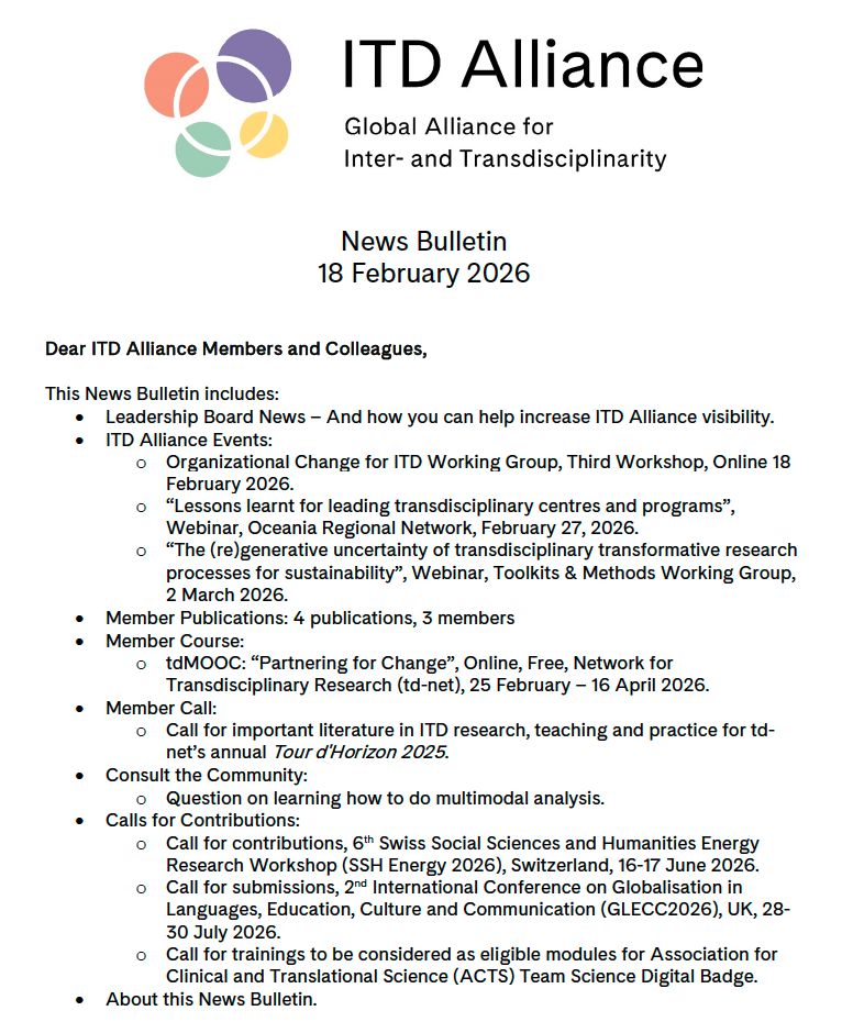 The ITD Alliance News Bulletin aims to provide sources of information about what is happening in inter- and transdisciplinarity and related collaborative boundary-crossing approaches. The News Bulletin focuses on the activities of the ITD Alliance and its members, along with relevant policy news in education, funding and research, as well as events and activities. The bulletin complements td-info, the newsletter of the Network for Transdisciplinary Research (td-net), a founding lifetime member of the ITD Alliance.