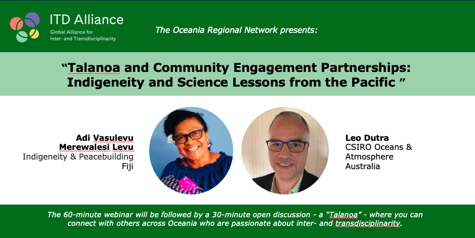 Moderation will be by Giedre Kligyte of the Transdisciplinary School at the University of Technology Sydney. This hour-long webinar will be followed by a 30-minute open discussion – a Talanoa – where you can connect with others across Oceania who are passionate about inter- and transdisciplinarity.
